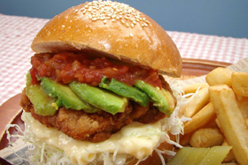 山賊焼きは、鶏肉をにんにく入りのたれに漬け込み、片栗粉をまぶして揚げた信州に伝わる郷土料理です。ピリ辛のサルサソースが食欲を引き立てます。フライドポテトとピクルス付き。