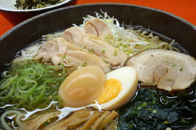 黄金シャモの鶏より出汁をとったさっぱり鶏塩ラーメン。麺はこだわりの北信地粉使用のメイドイン白馬麺、白馬の青こしょうで刺激と香を。満足の野沢菜じゃこめしとごいっしょにご賞味ください。