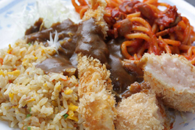 ナポリタン、チャーハン、エビフライ、カニクリームコロッケに、スパイシーなカレーソースがかかった”大人版お子様ランチ”です。ペコペコのお腹を絶対満足させちゃいます。