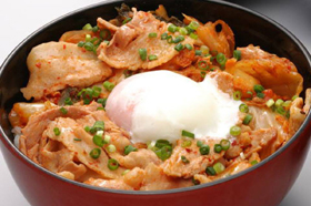 豚肉と相性抜群のキムチが丼になりました。仕上げに温泉卵が乗っかって、ガッツリ食べたいときにお腹が大満足する丼です。