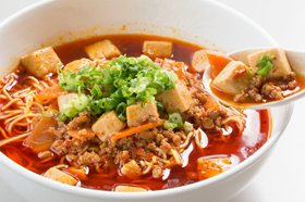 真っ赤なラー油と、ほくほくの豆腐と、白馬豚の挽肉がたっぷりかかった、辛さと、旨みがたっぷりのラーメン。本格山椒油の香りと、しびれる辛さが後を引く旨さ。冷えた体を温めるこの冬絶対おすすめのラーメンです。