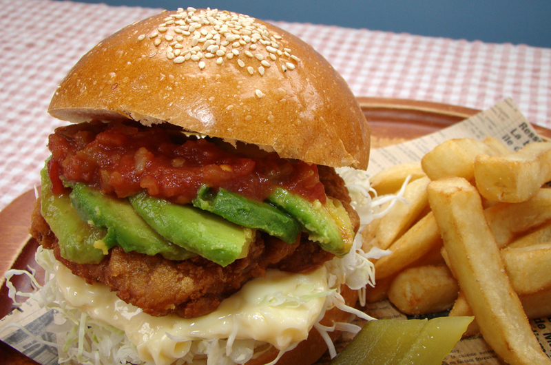 信州のご当地B級グルメ"山賊焼き"とピリ辛いサルサソースが食欲を引き立てます。食べ応えと満足感が嬉しいバーガーです。