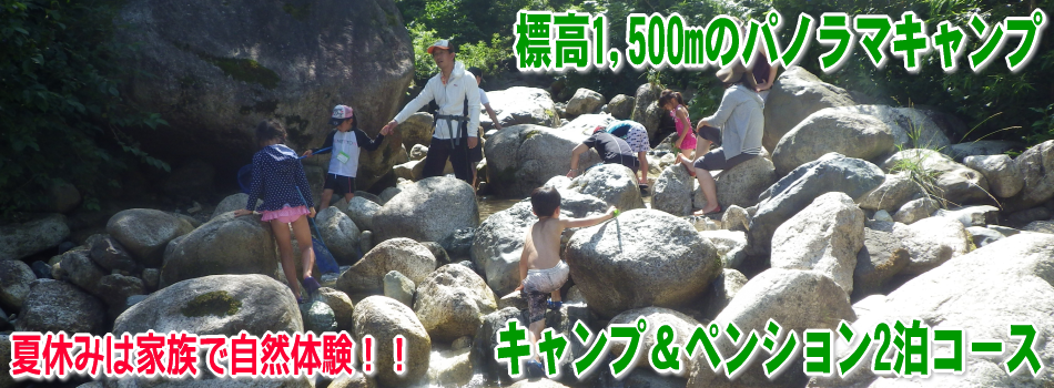 【標高1,500mのパノラマキャンプ・キャンプ&ペンション2泊コース】は、ファミリー1泊コースに続けて2日目の午後からペンションオーナーといっしょに川遊び。ダム作りをしたり、小さな滝にうたれてみたり、こども達は水遊びが大好きです。宿自慢の洋風家庭料理の夕食のあとはナイトプログラムもあるよ。