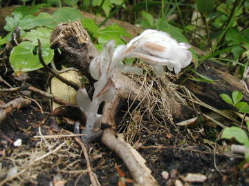 ギンリョウソウも小遠見山トレッキングコースではまだ私は2株しか見たことがありません。写真は小遠見山山頂ちょっと手前に咲いていたものです。別名ユウレイダケ、とても薄気味悪い花です。図鑑を見ると【腐生植物】とかって書いてある。ネットで用語の解説を呼んだら【生物の死体から養分を得て生育する植物】だって・・・・・お〜怖い怖い。