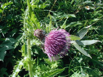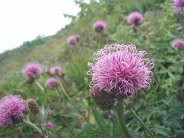ともに高さ1mくらいになることもある目立つ花です。タクラソウはアザミの花とよく似ていますが、葉のトゲがなくやさしい印象の花です。対照的にオニアザミはその名の通り茎も太く葉にも鋭いとげがあり強そうな印象です。遊歩道を歩いていると時折チクッと刺さったりします。オニアザミに負けない迫力といえば