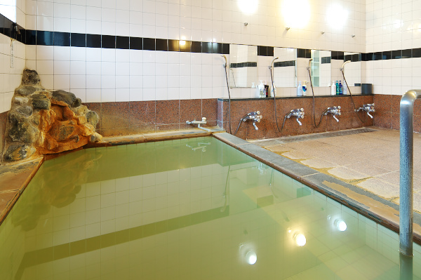 館内の内湯は、当館すぐ横にある「かたくり温泉十郎の湯」と同じ源泉を使っています。湯舟に入る際は、手すりもありお年寄りの方でも安心です。
