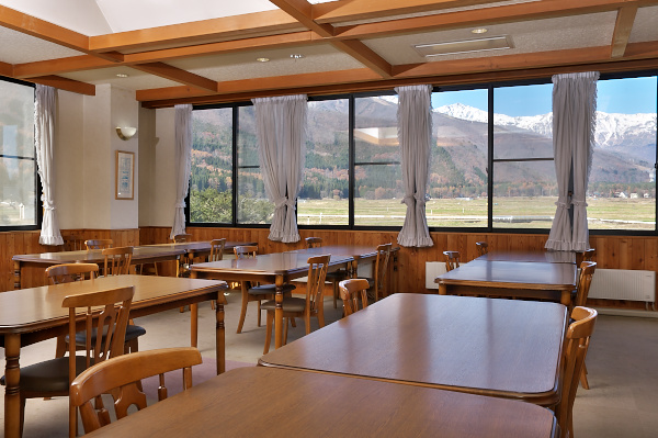 北アルプスを眺めることのできる食堂で、お食事のひとときをお過ごしください。白馬ジャンプ台も見えます。