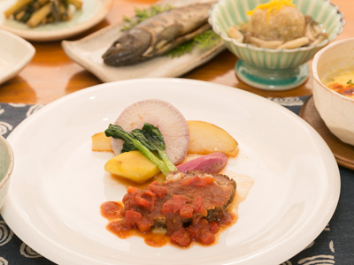 器は「瀬戸」と「益子」の窯元より厳選。また、地元の陶芸作家さんの作品を使って料理を彩ります。