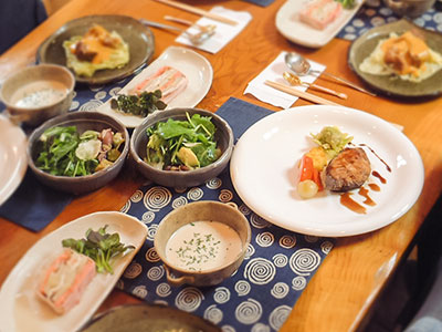 厳選した地元の食材を利用した田舎料理をお出しします。自家製のお米,大豆から手作りのお味噌,野菜。山で採れる山菜、きのこ等、季節毎にそして来る度に変わる創作メニュー。何度も楽しんでいただけます。