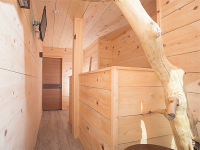 オーナーが裏山から切り出してきた本物の檜を、自らチェーンソーで製材。部屋全面を天然檜の一枚板で囲う贅沢なつくり。黒松のハンガーホルダーも象徴的です。