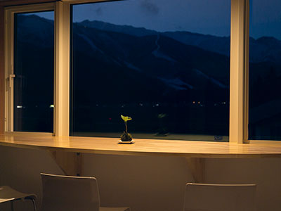 白馬三山を正面に捉えたバーカウンターテーブルを用意しました。専用の冷蔵庫を利用して景色を肴に一杯楽しめるカウンターです。四季により彩りを変える風景をお楽しみください。冬期は五竜とおみスキー場のナイターを夜景として楽しめます。