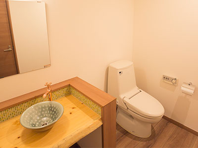 広い専用トイレと硝子タイルのかわいい洗面台。洗面鉢は益子焼です。