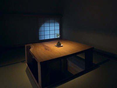 特別な茶室があります。ここで共有した時間は心の距離を近づける事でしょう。角の無いジュラク(珪藻土)の天井は無限の宇宙を感じさせます。プラネタリウムも楽しめます。「お酒を持って入ると戻れなくなる。」「時間を忘れて気がついたら朝だった。」など、まるで浦島太郎の様な体験報告を頂いております。